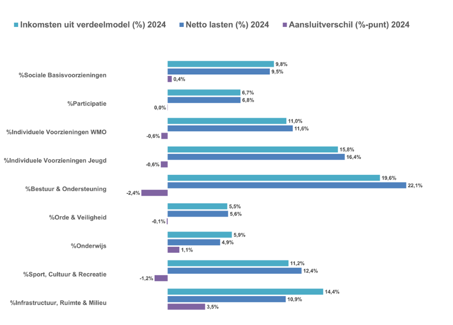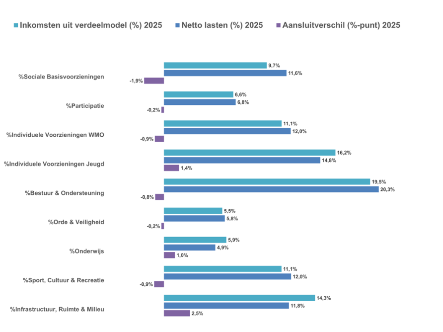 Het aansluitverschil per cluster wordt gedefinieerd als het verschil tussen de inkomsten uit het verdeelmodel en de netto lasten per uitgavencluster (uitgedrukt in het relatieve aandeel van de totale uitgavenclusters). In het hierboven beschreven voorbeeld resulteert dat in een aansluitverschil van 1,1%-punt voor het cluster Onderwijs. Een positief aansluitverschil duidt erop dat het cluster in het verdeelmodel van het gemeentefonds een groter relatief aandeel heeft t.o.v. het relatieve aandeel in de netto lasten en vice versa.