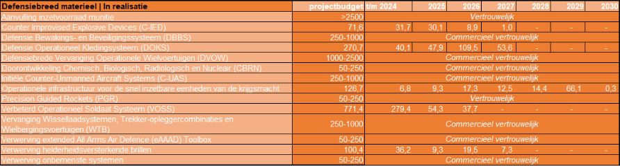 Defensie werkt onverminderd door aan de realisatie van het investeringsprogramma voor materieelprojecten, digitalisering en infrastructuur. In lijn met de Defensienota 2024 wordt aanvullend geïnvesteerd in lucht- en raketverdediging, voortzettingsvermogen en versnelde realisatieplannen. Waar mogelijk versnelt Defensie projecten die nodig zijn voor de prioriteit hoofdtaak 1, het beschermen van het Nederlandse grondgebied en dat van onze bondgenoten. Versnelling is nodig door de veranderde internationale verhoudingen. Defensie zal prioriteiten moeten stellen en versnellen. We blijven inzetten op een versnelling van de versterking van de krijgsmacht op korte termijn waar ook op langere termijn van wordt geprofiteerd.