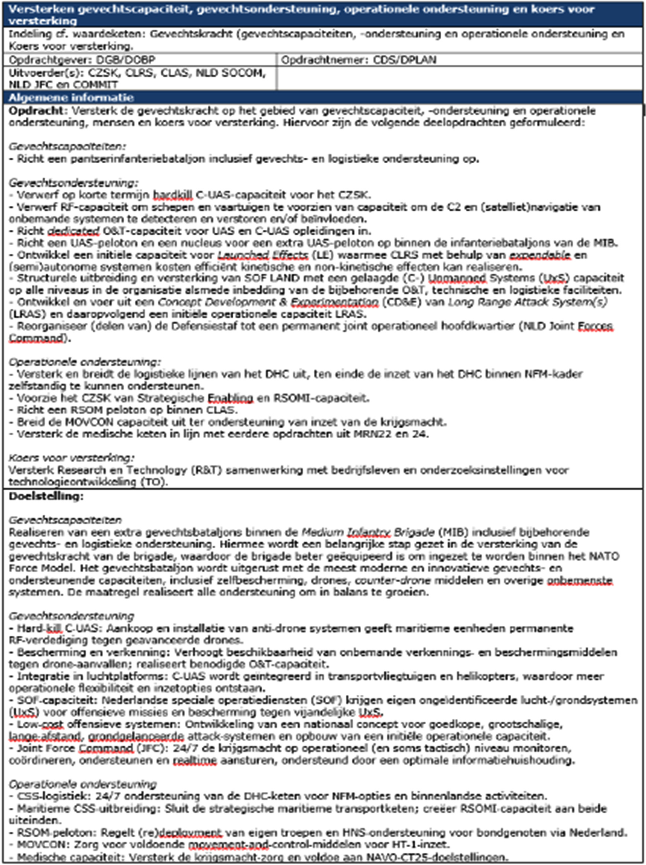 Defensie investeert in de gevechtskracht. Onder andere door het versterken van de gevechtsondersteuning door te investeren in drones, attack drones en counter-drones. Gelet op de toenemende dreiging van drones zijn deze versterkingen cruciaal. Tevens investeert Defensie in het operationeel hoofdkwartier waardoor Defensie in staat is om het optreden van de krijgsmacht 24/7 (op het operationele en in sommige gevallen tactische niveau) te monitoren, te coördineren, te ondersteunen en real- time aan te sturen, ondersteund door een optimale informatiehuishouding.