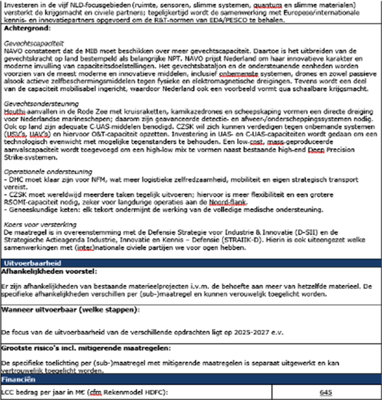 Om tijdig verplichtingen aan te kunnen gaan voor gevechtskracht, innovatie en randvoorwaarden maar ook cruciale investeringen in de bestrijding van drones wordt het verplichtingenbudget € 820,3 miljoen naar boven bijgesteld.