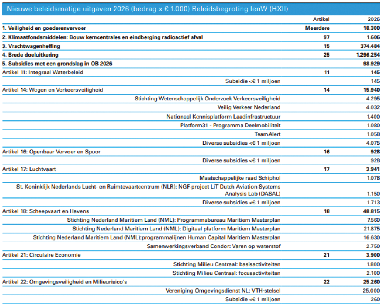 In deze brief wordt achtereenvolgens ingegaan op de nieuwe beleidsuitgaven van de beleidsbegroting (HXII), het Mobiliteitsfonds (A) en het Deltafonds (J). In de overzichten zijn alleen de uitgaven voor 2026 opgenomen, omdat alleen deze uitgaven op basis van artikel 105 van de Grondwet ter autorisatie aan het parlement worden voorgelegd. In de toelichting van de maatregelen is de meerjarige doorwerking opgenomen.