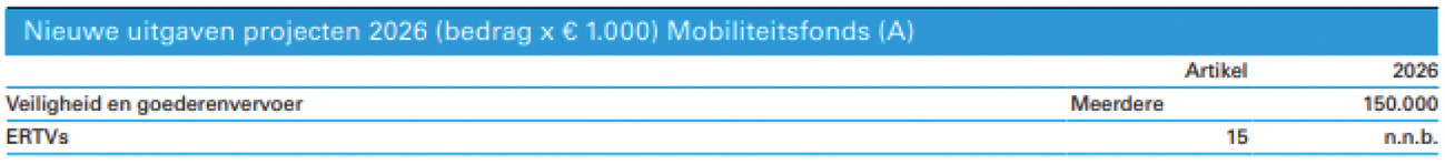 Er is € 150 miljoen gereserveerd voor maatregelen vanuit het regeerprogramma op het gebied van (sociale) veiligheid en goederenvervoer. Een deel van dit budget wordt overgeboekt van het Mobiliteitsfonds naar de beleidsbegroting van IenW (HXII) (€ 18,3 miljoen). Het budget wordt onder andere ingezet voor beveiligingsmaatregelen (zoals Bodycams) door de NS, het oplossen van knelpunten op het gebied van truck parkings en het programma goederenvervoer. Zonder dit budget kunnen de betrokken partijen nog niet starten met deze maatregelen.