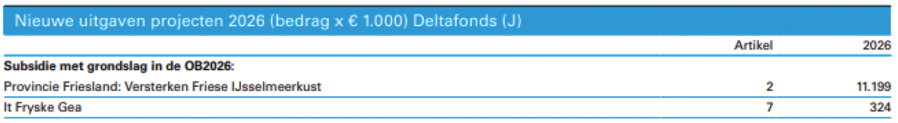 Voor het Deltafonds zijn er twee subsidies met een (voorgenomen) grondslag in de begroting 2026. De subsidie voor de provincie Friesland is onderdeel van het Programma-aanpak Grote Wateren (PAGW) en is bedoeld voor de verkenning en het eerste deel van de realisatie voor het versterken van de Friese IJsselmeerkust. De subsidie It Fryske Gea is bedoeld voor de herinrichting van het Makummernoordwaard. Hierin kan mogelijk vertraging ontstaan indien de Ontwerpbegroting 2026 na 1 januari 2026 wordt geautoriseerd.