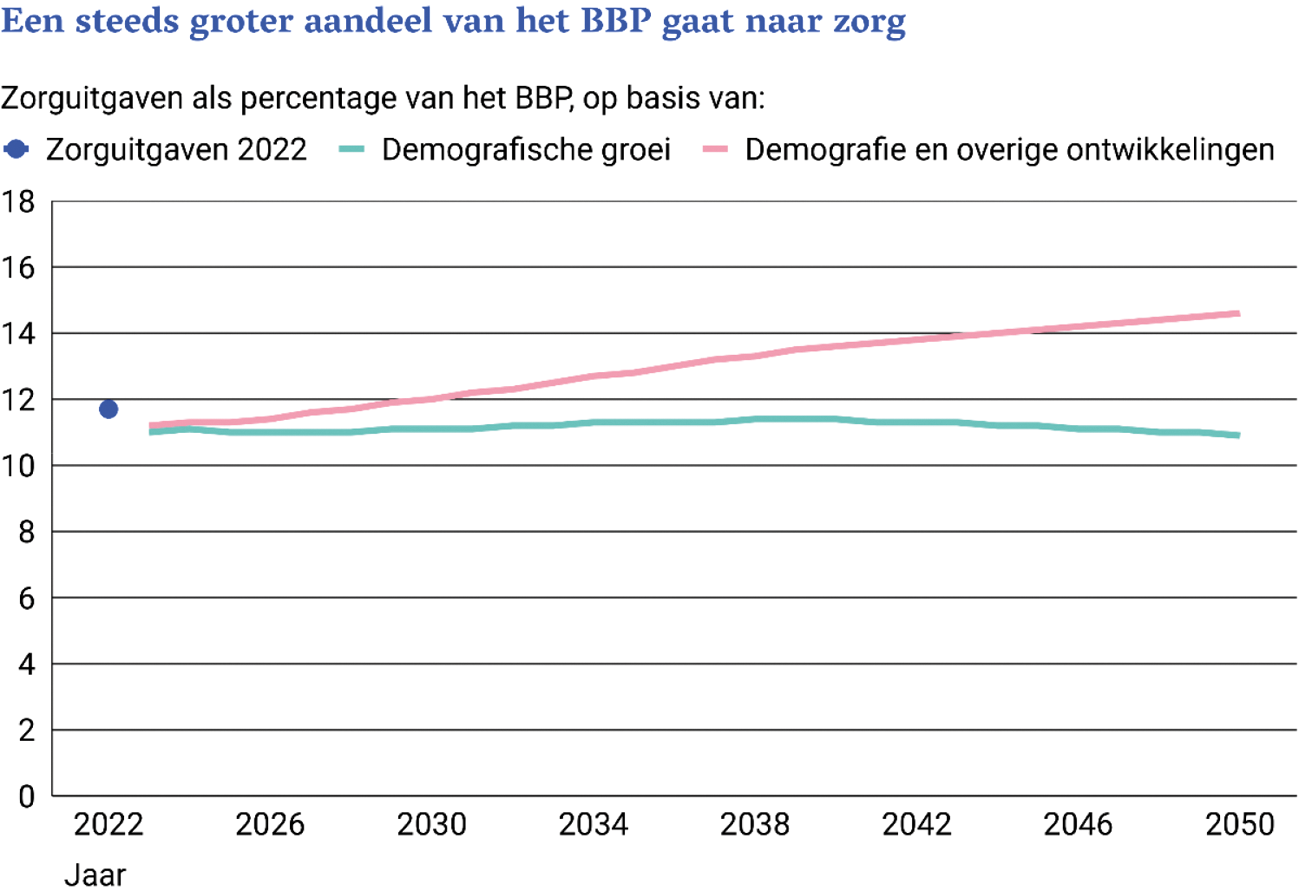 De stijging van zorguitgaven ten opzichte van andere overheidsuitgaven. Uit ramingen van het RIVM1 blijkt dat als percentage van het Bruto Binnenlands Product (BBP) de zorguitgaven oplopen van 11,2% in 2023 tot 14,6% in 2050 (zie onderstaande figuur). Hierbij is geen rekening gehouden met stijgende personeelstekorten in de zorg. |