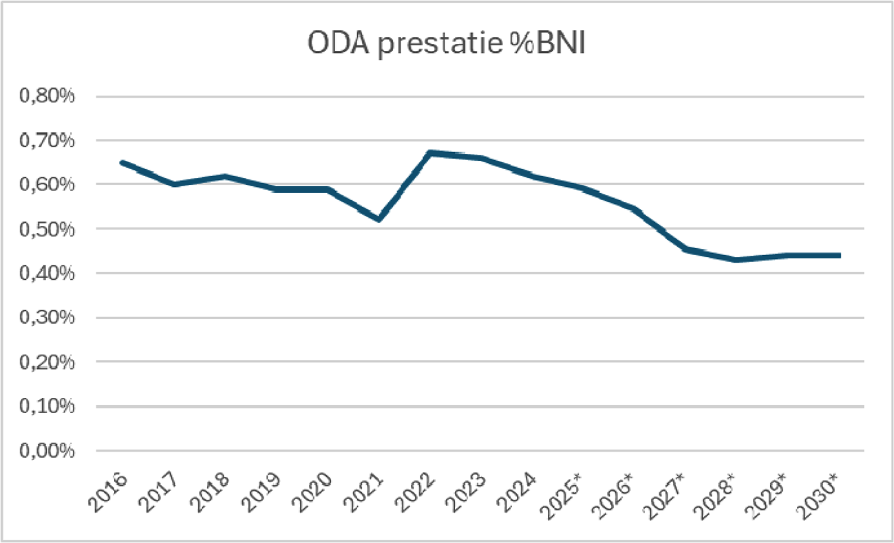 Als gevolg van de bezuinigingen op ontwikkelingshulp van het kabinet Schoof daalt het totale Nederlandse ODA-budget van EUR 7,2 miljard in 2025 naar EUR 5,9 miljard vanaf 2029. Het betreft hier het totaal van het ODA-budget zoals dat op verschillende delen van de Rijksbegroting staat. Het percentage van het bruto nationaal inkomen (bni) dat Nederland uitgeeft aan ontwikkelingshulp daalt daardoor in 2029 naar 0,44%. Onderstaande grafiek laat het verloop zien van de Nederlandse ODA-prestatie tussen 2016 en 2030.3