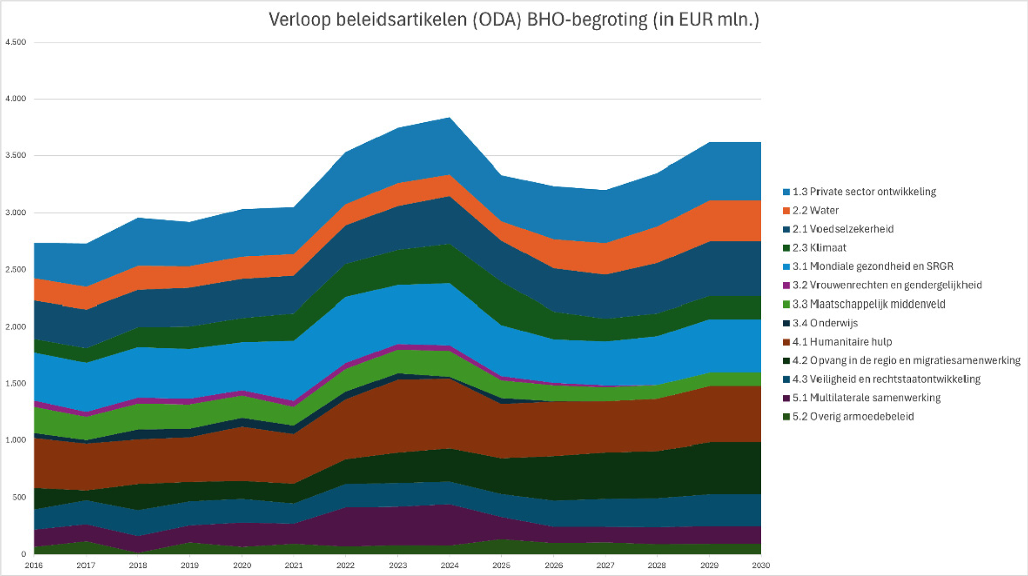 Het grootste deel van het Nederlandse budget voor ontwikkelingshulp (ODA) staat op de begroting voor Buitenlandse Handel en Ontwikkelingshulp (BHO). Vanaf 2029 gaat het om ca. EUR 3,9 miljard. Onderstaande grafiek laat het verloop zien van de verschillende sub-artikelen binnen het BHO budget tussen 2016 en 2030.4 Tussen 2023 en 2026 stijgt het aandeel van het ODA-budget dat op de begroting van AenM staat van 17% naar 26% als gevolg van stijgingen in de ramingen voor de uitgaven aan eerstejaars asielopvang. Daardoor zijn in die jaren bezuinigingen verwerkt op de BHO-begroting. Doordat deze asieluitgaven vanaf 2027 gemaximeerd zijn op 10% van het ODA-budget, is de kans op grote tegenvallers op de BHO-begroting vanaf dat jaar kleiner.