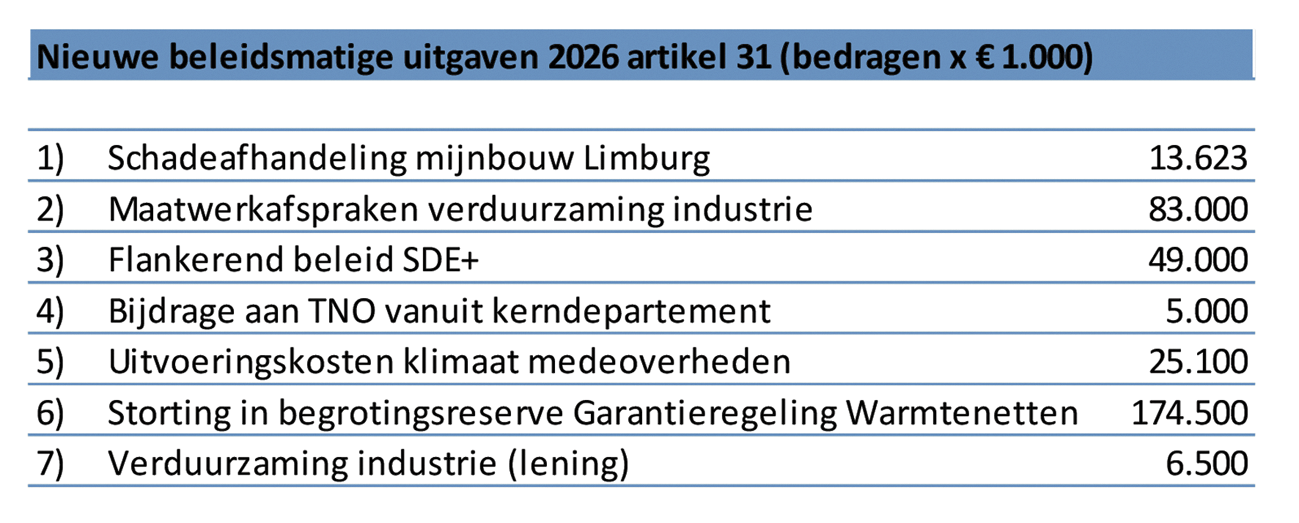 Hierbij bied het kabinet de Kamer een overzicht aan van de nieuwe beleidsuitgaven die zijn opgenomen in de Ontwerpbegroting 2026 van het Ministerie van Klimaat en Groene Groei. In de bijlage zijn alleen uitgaven voor 2026 opgenomen, omdat alleen deze uitgaven ingevolge artikel 105 van de Grondwet ter autorisatie aan het parlement worden voorgelegd.