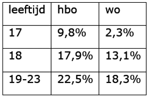 Wat is op dit moment de participatiegraad in het hoger onderwijs? De Referentieraming 20255 toont in Figuur 3.3 de participatiegraad, gedefinieerd als het aantal studenten in Nederland van een bepaalde leeftijd gedeeld door het totale aantal personen van deze leeftijd in Nederland, in het hoger onderwijs voor 17-jarigen, 18-jarigen en 19- tot en met 23-jarigen, hieronder in tabelvorm weergegeven. ![]() |