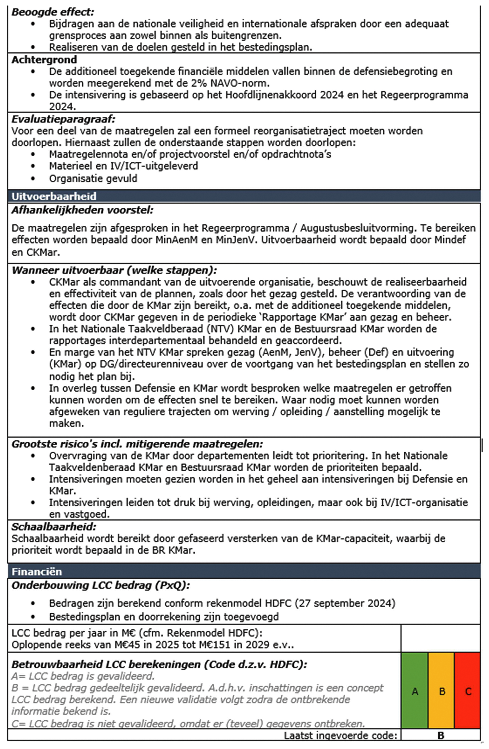Middels de SBS wordt de kamer geinformeerd over de beleidskeuzes KMar Grensbewaking en ophoging SecFund. Het CW 3.1 kader voor de steun aan Oekraine volgt via de periodieke leveringenbrief die uiterlijk september wordt verstuurd aan de kamer. Het kader voor Middelen Nationale Veiligheid MIVD is vertrouwelijk en wordt daardoor niet openbaar gemaakt. Dit volgt via de bekende procedure.