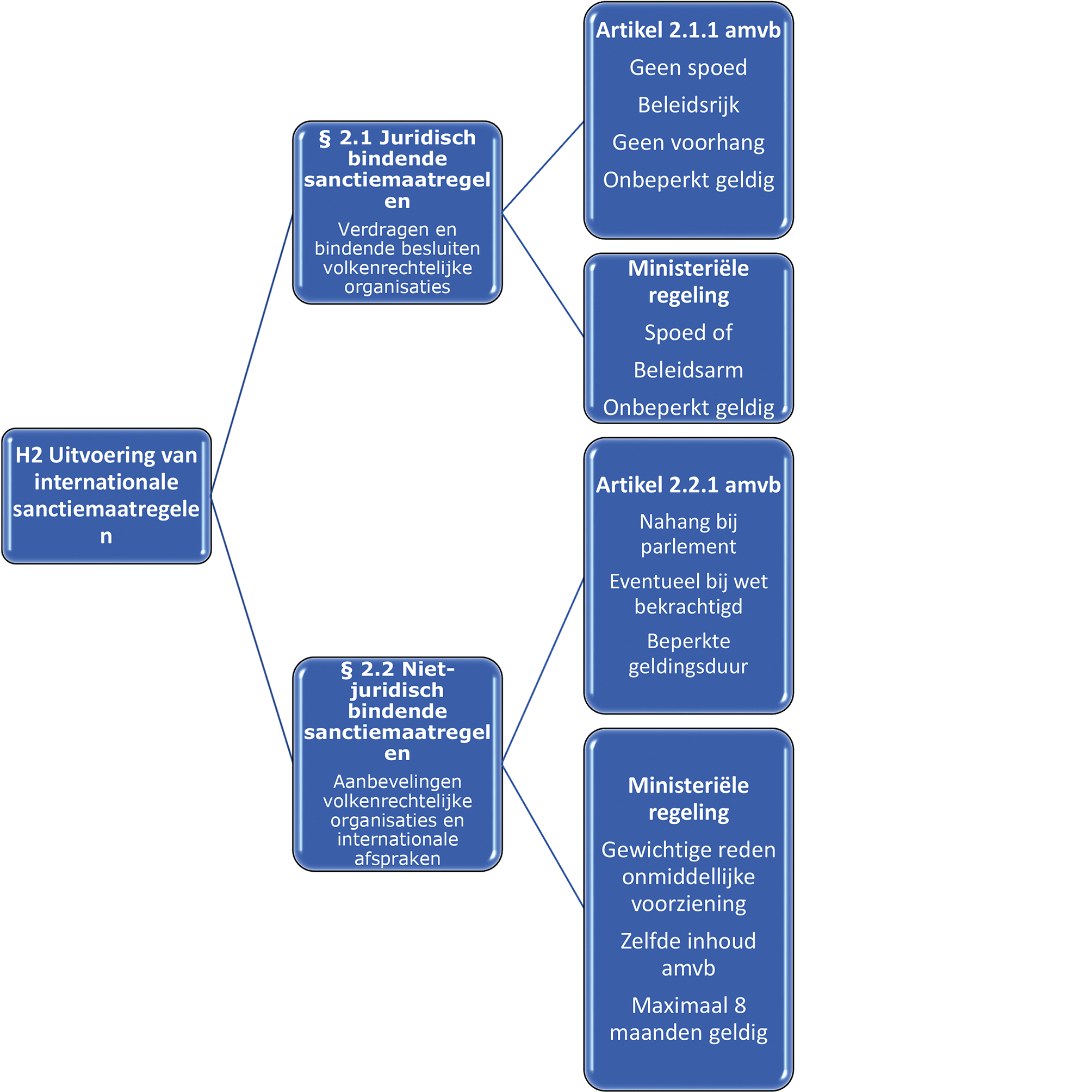 De Sanctiewet 1977 kent vier internationale grondslagen op basis waarvan in Nederland uitvoeringsregels kunnen worden gesteld, namelijk internationale sanctiemaatregelen uit (1) verdragen; (2) bindende besluiten van volkenrechtelijke organisaties; (3) aanbevelingen van volkenrechtelijke organisaties, en (4) internationale afspraken. Internationale sanctiemaatregelen die voortvloeien uit verdragen of besluiten van volkenrechtelijke organisaties zijn juridisch bindend. Daar kan uitvoering aan worden gegeven bij algemene maatregel van bestuur of bij ministeriële regeling, als de te stellen regels alleen strekken ter uitvoering van de verplichtingen in kwestie.31 Aanbevelingen van volkenrechtelijke organisaties en internationale afspraken (zoals internationale beleidsafspraken, zogenaamde Memoranda of Understanding) hebben weliswaar een politiek bindend karakter, maar geen juridisch bindend karakter. Uitvoeringsregels ter voldoening van deze aanbevelingen en internationale afspraken kunnen daarom in beginsel alleen bij algemene maatregel van bestuur worden gesteld.32