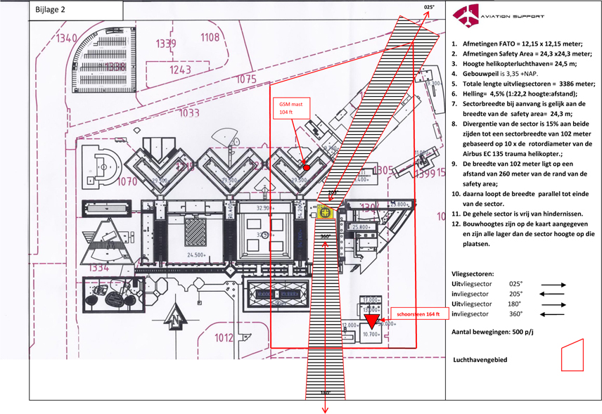 Uit separaat aangeleverde informatie is gebleken dat binnen de 48 Lden geluidscontour geen woningen zijn gelegen. Binnen 500 meter van de luchthaven is een studentenflat gelegen op 475 meter. Op grond van de Luchtvaartnota is gemotoriseerde luchtvaart binnen 500 meter van woningen alleen toegestaan, indien door de aanvrager is aangetoond dat het piekniveau bij de woning of andere geluidsgevoelige bestemming niet meer is dan 70 dB(A) Lmax gedurende de dagperiode (van 07.00 - 19.00 uur) en niet meer is dan 65 dB(A) Lmax gedurende de avondperiode (19.00 - 23.00 uur). Het landen en opstijgen tijdens de nachtperiode is niet toegestaan. Dit geldt niet voor traumavluchten. Op basis van overgelegde overflight gegevens is door ons de geluidsbelasting bepaald van de helikopters waarvan gebruik wordt gemaakt. De voor deze helikopters minimaal aan te houden afstanden tot woningen of andere geluidsgevoelige bestemmingen zijn opgesomd in onderstaande tabel.