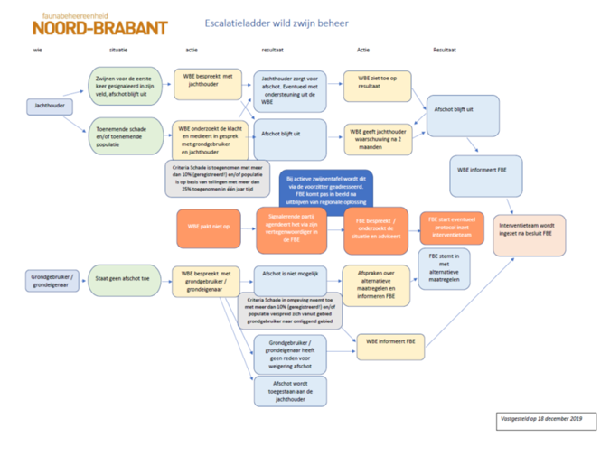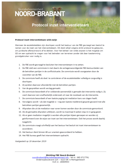 Dat de leden van het interventieteam wilde zwijnen deze handelingen pas mogen uitvoeren nadat de Faunabeheereenheid Noord-Brabant, de in bijlage 2 opgenomen escalatieladder heeft doorlopen, het in bijlage 3 opgenomen besluitvormingsprotocol volledig heeft afgerond en de Faunabeheereenheid Noord-Brabant daarvoor toestemming heeft verleend.
