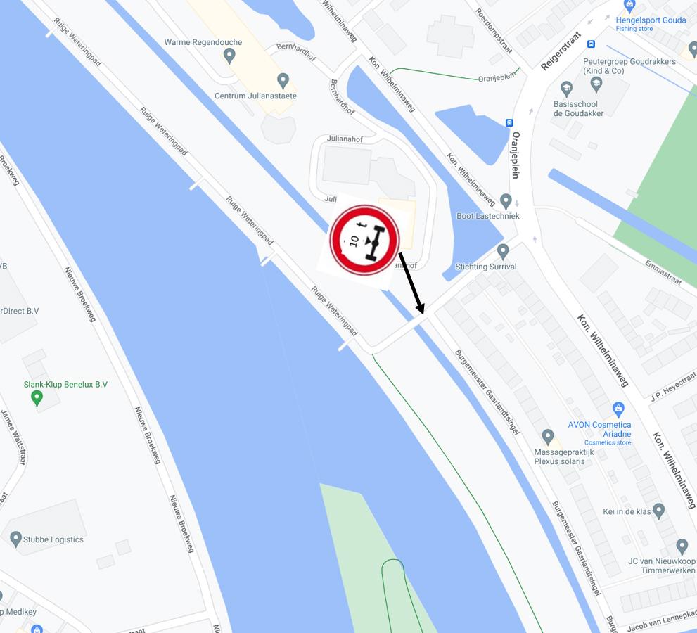 Voor het de in de gemeente Gouda gelegen brug tussen het Ruige Weteringpad en de Nachtegaalstraat een aslastbeperking van 10 ton in te stellen, middels de plaatsing van bord C20 (10t) uit bijlage I van het Reglement verkeersregels en verkeerstekens 1990 (RVV);