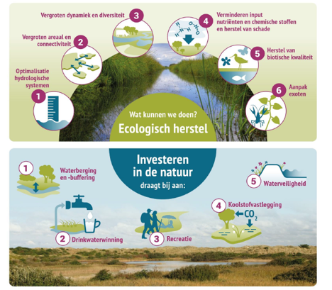 Natuur en water; Er zijn diverse mogelijkheden om de ontwikkeling van de natuur en de aanpak van de Natura 2000-gebieden optimaal te laten samengaan met het verbeteren van de condities van de kwantiteit en de kwaliteit van het water. Er wordt daarbij maximale synergie gezocht met maatregelen om te voldoen aan de KRW en de Nitraatrichtlijn.
