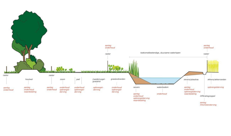 Het realiseren van ecologische functies aan watergangen. Deze betreffen de functie natuurwater en natte EVZ voor de doelsoorten winde, kamsalamander en rietzanger). Deze functies vragen een specifieke (ecologische) inrichting, beheer en onderhoud van de watergang. Deze functies worden veelal in combinatie met andere doelen/functies (bv. KRW) gerealiseerd.