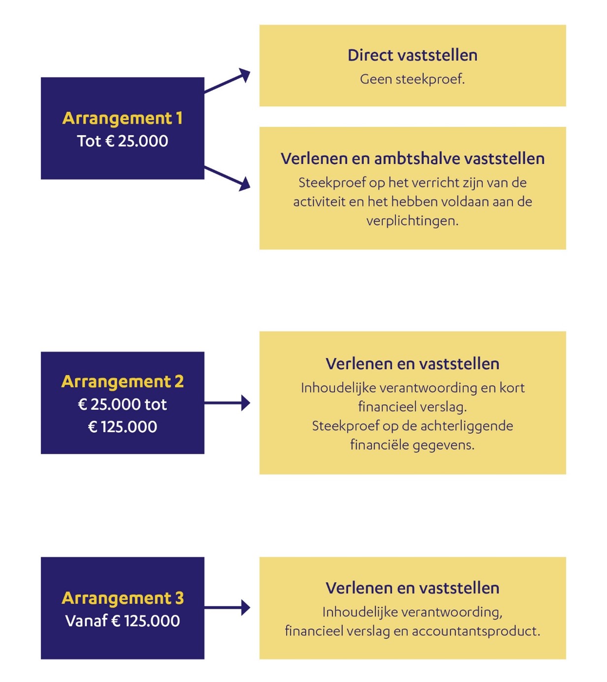 De Asv gaat uit van proportionaliteit tussen het subsidiebedrag en de administratieve lasten. Hoe lager het subsidiebedrag, des te lager zijn de eisen die aan de verantwoording worden gesteld. Aan dit proportionaliteitsbeginsel is invulling gegeven door het opnemen van drie standaard uitvoerings- en verantwoordingsarrangementen waarvan de toepassing wordt bepaald door de hoogte van het subsidiebedrag: