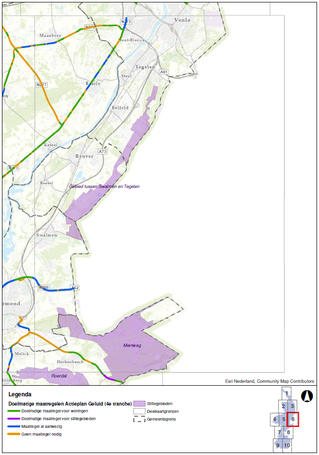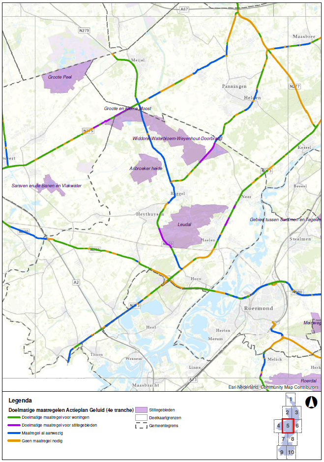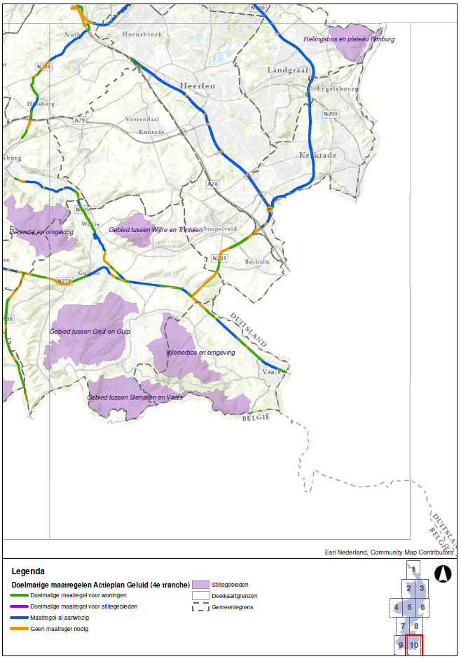 In vier stiltegebieden is het oppervlak met een geluidbelasting groter dan 40 dB(A) de afgelopen planperiode afgenomen als gevolg van maatregelen uit het actieplan. Het gaat concreet om de Jabeekse bossen en Schinveldse bossen (maatregel N274), Asbroekerheide (maatregel N279) en Leudal (maatregel N273 en N279).