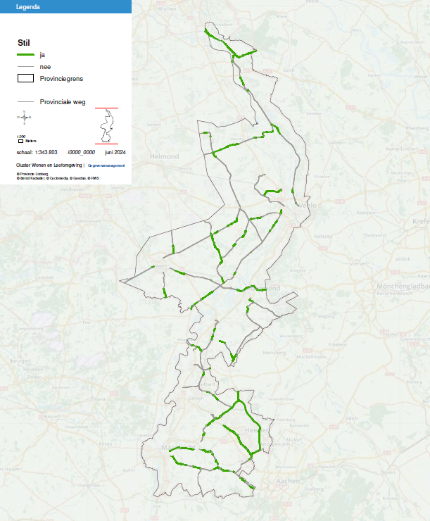 De Provincie Limburg heeft 31 stiltegebieden aangewezen, waarin de normale geluiden van de natuur zo min mogelijk worden verstoord. Vanwege de belangrijke functie die stiltegebieden vervullen, zijn er in de Omgevingsverordening ook regels opgenomen die een toename van ongewenst geluid in stiltegebieden voorkomen of beperken. Ook bij de geluidbelastingkaarten en actieplannen die provincies opstellen wordt aandacht besteed aan het geluid in stiltegebieden dat veroorzaakt wordt door het verkeer op de provinciale wegen. Zo investeert de Provincie Limburg onder andere in geluidreducerend asfalt op provinciale wegen in de directe omgeving van stiltegebieden.