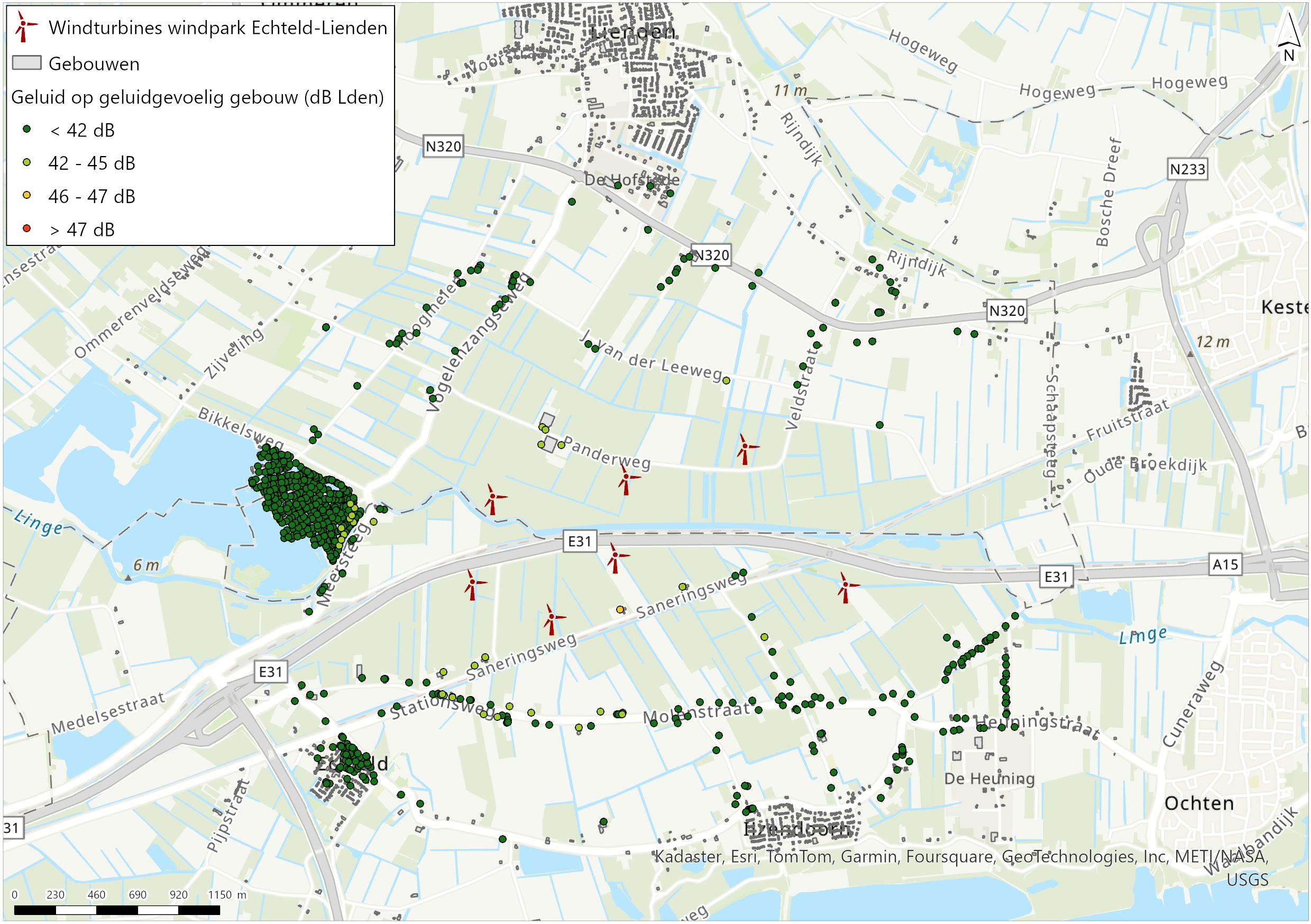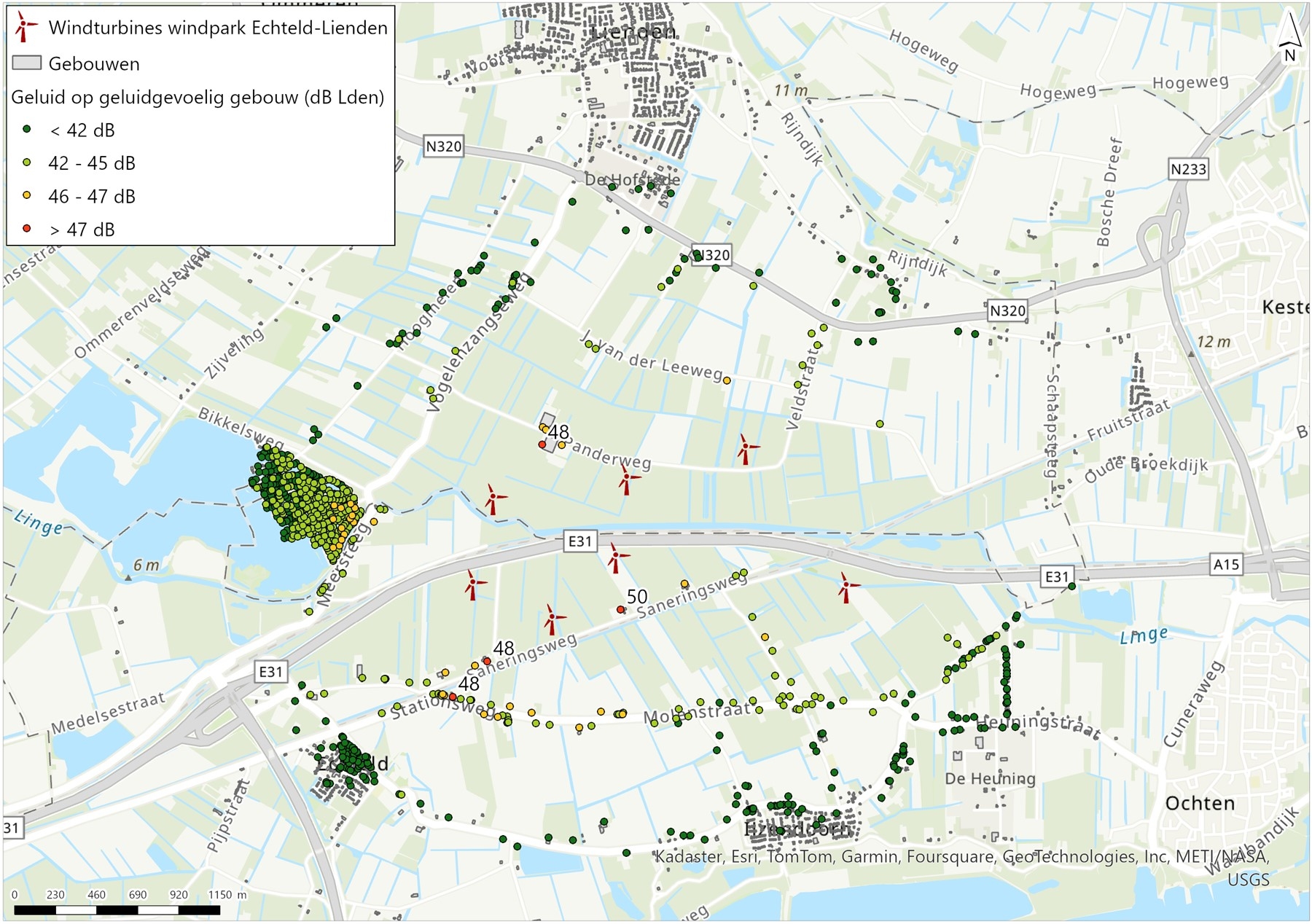 de geluidsnorm van de windturbines ter plaatse van gevoelige objecten bedraagt maximaal 47 dB Lden en 41 dB Lnight;