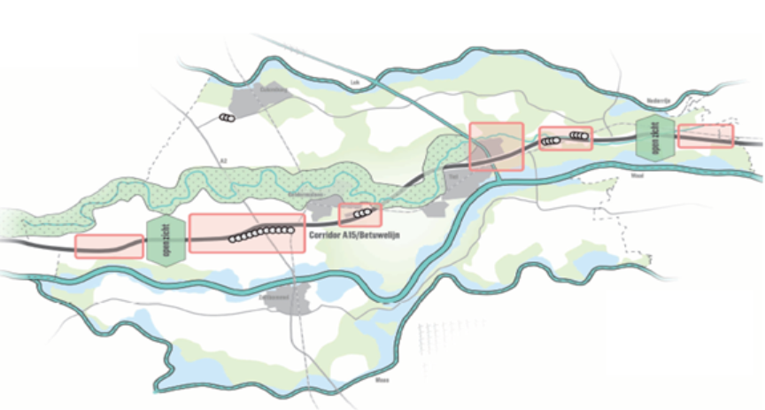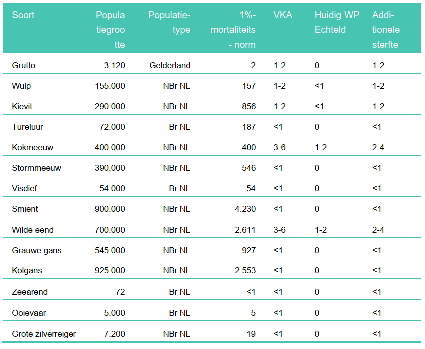 Vogels (broedvogels) | Grutto | Doden van individuen | - Alle windturbines ten noorden van de rijksweg A15 worden uitgerust met een stilstandvoorziening; - De stilstandvoorziening is gedurende de daglichtperiode (tussen zonsopkomst en zonsondergang) in werking; - De stilstandvoorziening is gedurende de periode in het jaar (half maart tot en met eind mei) dat veel baltsvluchten en andere risicovolle vluchten van de grutto op rotorhoogte plaatsvinden in werking; - Naar aanleiding van nader ecologisch onderzoek en/of in te zetten technische maatregelen waaronder camera- of radardetectie kan de aard en omvang van de stilstandvoorziening worden herzien of verder gespecificeerd, echter uitsluitend in afstemming met en na goedkeuring van de provincie Gelderland. |
