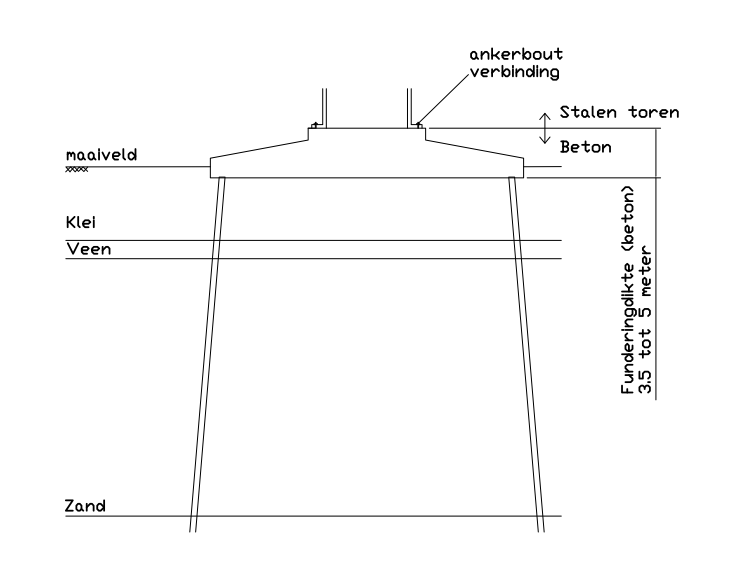 De windturbine wordt bevestigd op een (betonnen) fundament (zie Afbeelding 7). Elk windturbinetype heeft een eigen principe ontwerp van de fundatie dat benodigd is voor de bouw van de windturbine. Ter voorbereiding op de bouw vindt detailengineering van de fundatie plaats. Deze wordt specifiek afgestemd op de locatie van elke individuele windturbine. De vereiste constructie- en sterkteberekeningen zullen dan ook – gezamenlijk met de exacte dimensies en detaillering van het fundament – uiterlijk drie maanden voor de start van de bouw ter goedkeuring aan het bevoegd gezag worden voorgelegd.