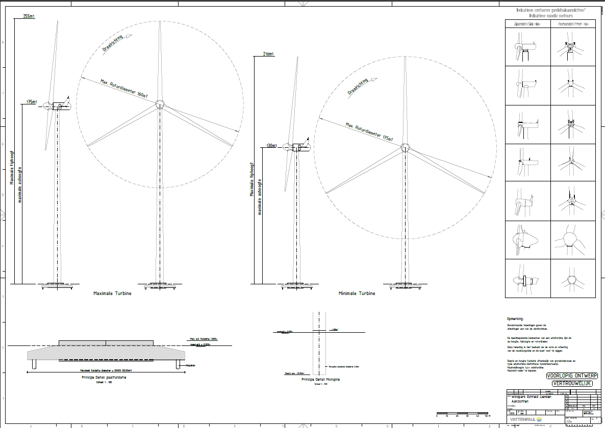 De windturbines krijgen een rotordiameter tussen 160 - 175 meter, een ashoogte tussen 130 - 175 meter. De maximale tiphoogte bedraagt 255 meter (zie Afbeelding 5).