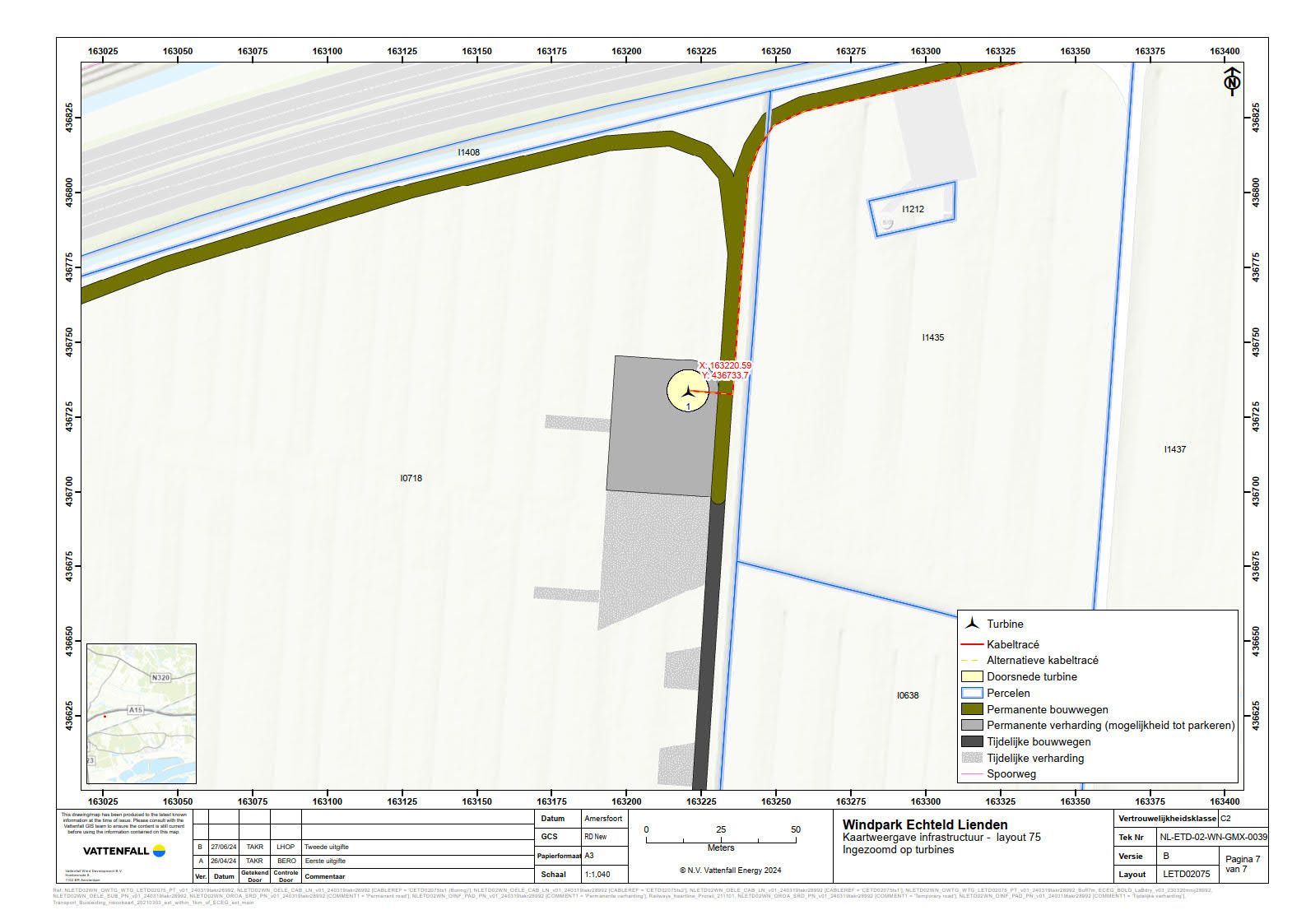 Ten behoeve van de windturbines worden permanente verhardingen (opstelplaatsen) (zie 2.2.2 voor de afmetingen hiervan), permanente toegangswegen en kabelverbindingen aangebracht (zie Afbeelding 11 tot en met Afbeelding 17). De aanvoerroute voor materialen is circa 5 meter breed, uitgezonderd bochten en kruisingen met andere wegen. De windturbines worden met een ondergrondse kabels onderling verbonden en verbonden met het onderstation (zie Afbeelding 10).