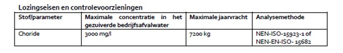 In de vergunning van 14 april 2017 staan geen lozingseisen voor chloride. Een gehalte van 3000 mg/l is echter zo hoog dat dit niet zonder meer kan worden toegestaan. Daarom is deze aanvraag ingediend. Voor de duidelijkheid merken wij op dat de voorschriften van de vergunning van 14 april 2007 ook gelden voor de nu aangevraagde lozing met chloride.