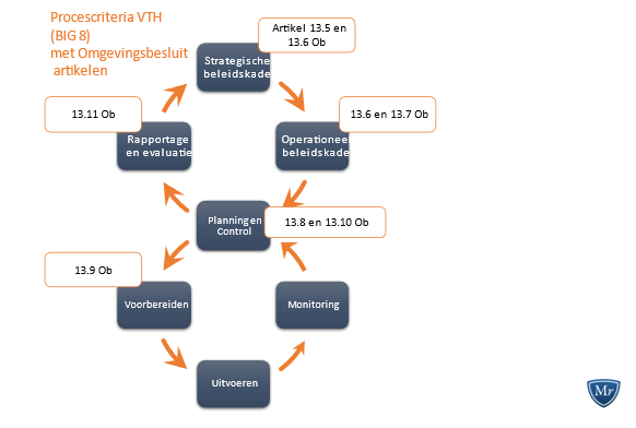 Naast een meerjarige U&H-strategie, eist de wet ook jaarlijkse uitvoeringsprogramma’s en evaluaties die bijdragen aan het bereiken van de doelstellingen uit de meerjarige strategie. Dit geheel vormt de beleidscyclus en staat bekend als de BIG 8-cyclus (zie figuur 1). De genoemde criteria in figuur 1 hebben betrekking op sec de uitvoering van de VTH-taken.
