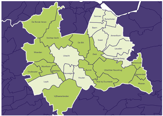 De U&H-strategie betreft het werkgebied van de twee omgevingsdiensten (zie afbeelding hieronder). Het betreft de gemeenten Amersfoort, Baarn, Bunnik, Bunschoten, De Bilt, De Ronde Venen, Eemnes, Houten, Leusden, Lopik, Montfoort, Nieuwegein, Oudewater, Renswoude, Rhenen, Soest, Stichtse Vecht, Utrecht, Utrechtse Heuvelrug, Veenendaal, Vijfheerenlanden, Wijk bij Duurstede, Woerden, Woudenberg, IJsselstein, Zeist en de provincie Utrecht.