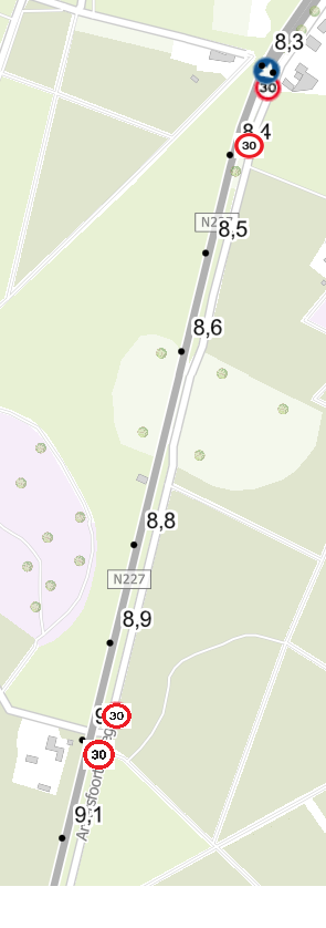De parallelweg van de N227 heeft een smal wegprofiel. Aanpassing hiervan heeft grote ruimtelijke en financiële consequenties. Over deze parallelweg gaat veel (brom)fietsverkeer, met name schoolverkeer. De snelheidsbebording is in de huidige situatie niet sluitend. Het deel van de parallelweg gelegen tussen hmp. 9.0 en hmp 9.7 is komend vanuit het noorden 60 km/uur en komend vanaf het zuiden 30 km/uur. De maximale snelheid van de parallelweg tussen hmp. 8.4 en hmp. 9.0 is 30 km/uur.