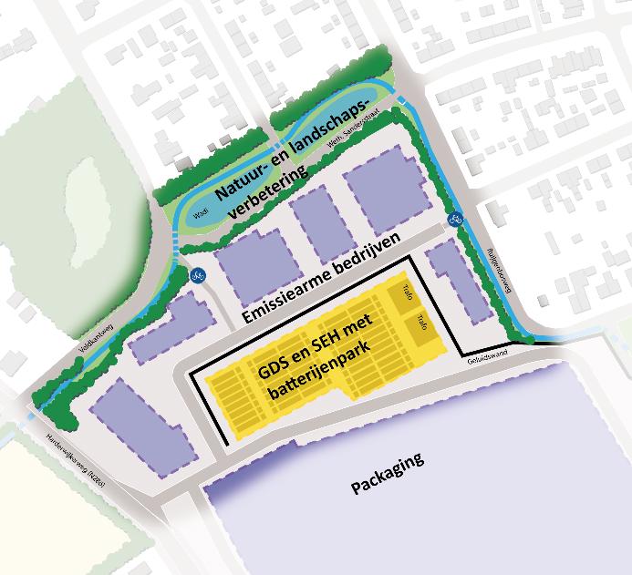 Behalve deze ontwikkeling denken wij ook aan de aanleg van een bedrijvenstrook op een deel van de locatie. Het gaat dan om een strook waar nieuwe, emissiearme bedrijvigheid kan komen. De precieze invulling is nog niet bekend.