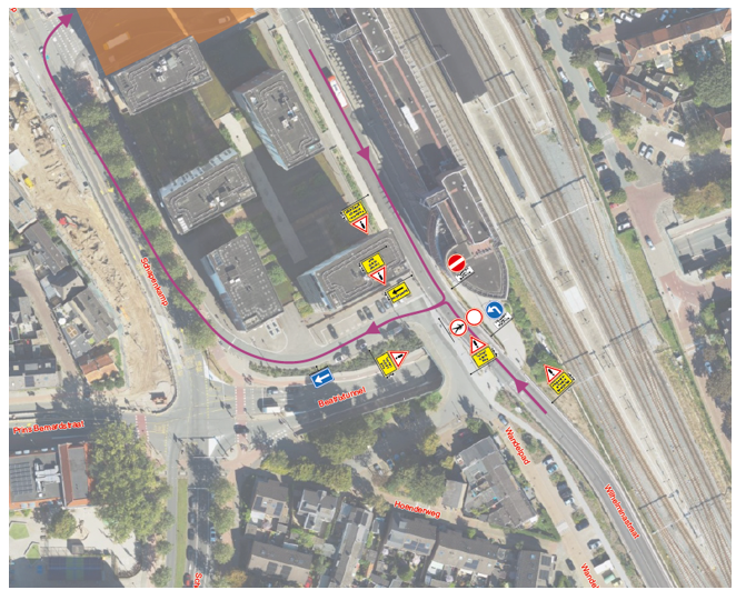 De maatregelen worden getroffen is ter hoogte van de busbaan t’Gooi met de kruising Prins Bernhardstraat. Het hekwerk langs de busbaan wordt verwijderd, waardoor de bus linksaf kan slaan. Dit wordt aangegeven door het bord D5-l. Alleen nood en hulpdiensten mogen wel rechtdoor rijden. Dit wordt aangegeven middels een onderbord.