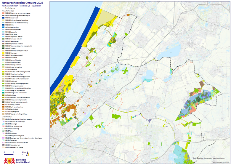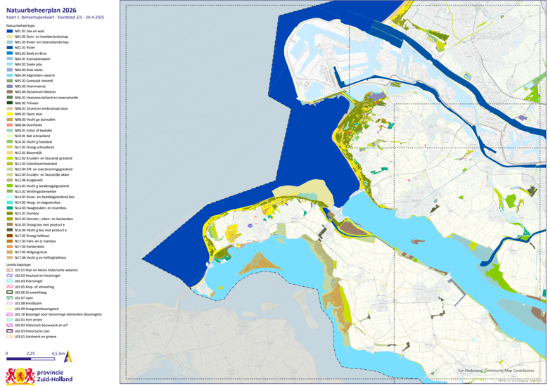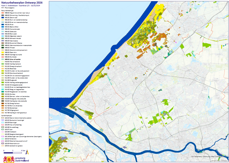 Kaart 2: Ambitiekaart: het op de ambitiekaart weergegeven natuur- of landschapsbeheertype geeft de provinciale ambitie voor die oppervlakte weer. Wanneer er voor (delen van) bestaande natuurgebieden een ander ambitietype is aangegeven dan het type dat op de beheertypekaart is aangegeven, betekent dit dat er de wens bestaat het bestaande natuur- of landschapsbeheertype om te vormen of door te ontwikkelen naar een nader natuur- of landschapsbeheertype. De ambitiekaart vormt daarmee de basis voor de subsidiëring van kwaliteitsimpulsen op grond van de Subsidieregeling Kwaliteitsimpuls Natuur en Landschap. Wanneer het een nog te realiseren natuurgebied betreft, is op de ambitiekaart aangegeven naar welk natuur- of landschapsbeheertype de bestaande situatie omgevormd kan worden. Ook dit kan via de Subsidieregeling Kwaliteitsimpuls Natuur en Landschap. In het geval het gebied op de ambitiekaart als N00.01 Nog om te vormen natuur staat zal de provincie bij een eventuele subsidieaanvraag beoordelen of het in de subsidieaanvraag voorgestelde natuur- of landschapsbeheertype wenselijk is. Indien dit niet het geval is kan de subsidieaanvraag niet gehonoreerd worden. Het is voor een potentiële aanvrager dan ook aan te bevelen om voorafgaand aan de subsidieaanvraag in overleg met de provincie te treden. De exacte begrenzing met diverse ondergronden is te raadplegen via de geoviewer op de site van de Provincie, onder Politiek en Bestuur, Geodata en kaarten, Informatieproducten Geo, Thema’s, Natuur en Landschap, Natuurbeheerplannen Zuid-Holland of via deze link https://atlas.zuid-holland.nl/Geoweb56/index.html?viewer=Natuurbeheerplan.