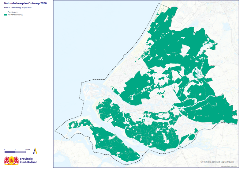 Kaart 6: Leefgebied dooradering: deze kaart kenmerkt zich door natte en droge elementen binnen het agrarische cultuurlandschap zoals sloten, poelen, moerasjes, plas-dras-percelen, laanbeplanting, singels, hout- en tuinwallen, heggen en hagen, struweelranden, dijken en slaperdijken, bermen van wegen en paden, steilrandjes en ruigtezomen. Binnen dit leefgebied kunnen agrarische collectieven met subsidie van de provincie beheerafspraken maken met agrariërs ten behoeve van verschillende diersoorten zoals vlinders, bijen, vogels en kleine zoogdieren. De exacte begrenzing met diverse ondergronden is te raadplegen via de geoviewer op de site van de Provincie, onder Politiek en Bestuur, Geodata en kaarten, Informatieproducten Geo, Thema’s, Natuur en Landschap, Natuurbeheerplannen Zuid-Holland of via deze link https://atlas.zuid-holland.nl/Geoweb56/index.html?viewer=Natuurbeheerplan.