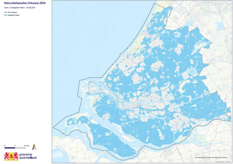 Kaart 7: Zoekgebied water: geeft zoekgebieden voor blauwe diensten voor de Zuid-Hollandse waterschappen weer. In deze zoekgebieden kunnen agrarische collectieven met subsidie van de provincie beheerafspraken maken met agrariërs ten behoeve van bijvoorbeeld waterkwaliteit en waterberging. De exacte begrenzing met diverse ondergronden is te raadplegen via de geoviewer op de site van de Provincie, onder Politiek en Bestuur, Geodata en kaarten, Informatieproducten Geo, Thema’s, Natuur en Landschap, Natuurbeheerplannen Zuid-Holland of via deze link https://atlas.zuid-holland.nl/Geoweb56/index.html?viewer=Natuurbeheerplan.