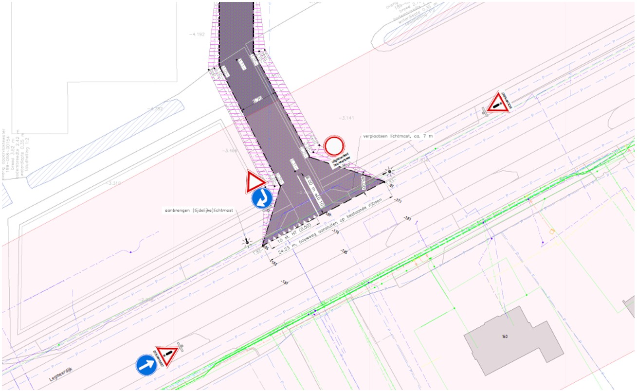 Om de veiligheid verder te verbeteren wordt er ook een verplichte rijrichting ingesteld. Het bouwverkeer moet vanuit het noordwesten (vanuit Amstelveen) komen zodat ze zonder belemmering de bouwinrit kunnen inrijden en bij het verlaten moet men naar het West zuid (Aalsmeer) rijden. Dit wordt aangegeven middels D5r (verplichte rijrichting rechtsaf).