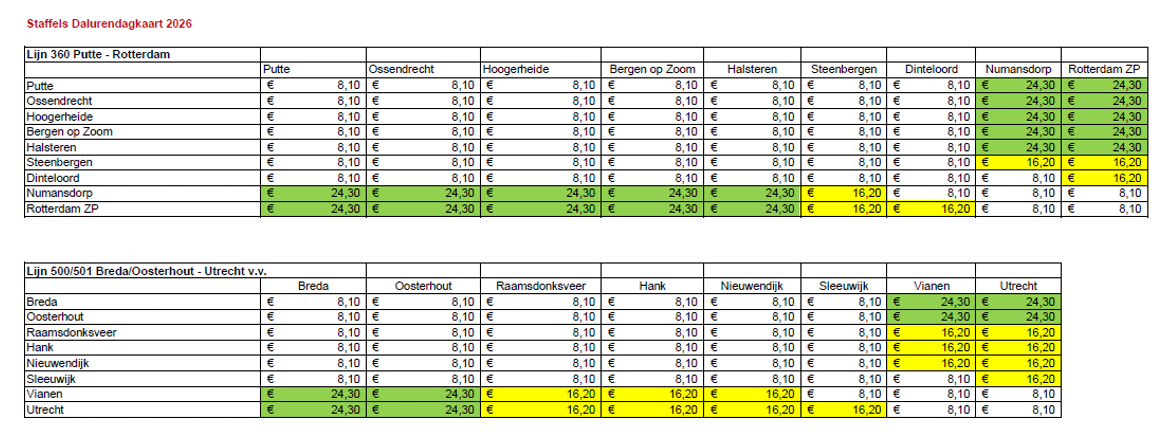 Voor de interregionale lijnen 360, 500 en 501 van de concessie West-Brabant geldt een staffel van het Dalurendagkaarttarief. De tarieven zijn afhankelijk van het deeltraject € 8,10, € 16,20 en € 24,30 (zie hiervoor bijlage 2).
