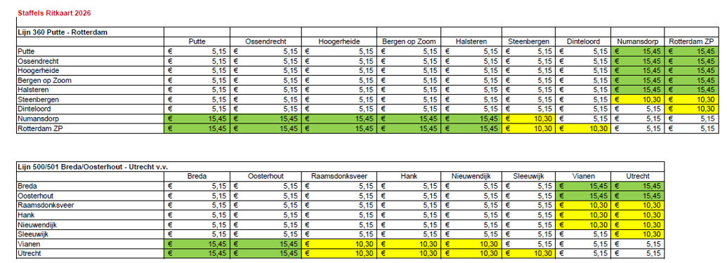 Voor de interregionale lijnen 360, 500 en 501 van de concessie West-Brabant geldt een staffel van het ritkaarttarief. De tarieven zijn afhankelijk van het deeltraject € 5,15, € 10,30 en € 15,45 (zie hiervoor bijlage 1).