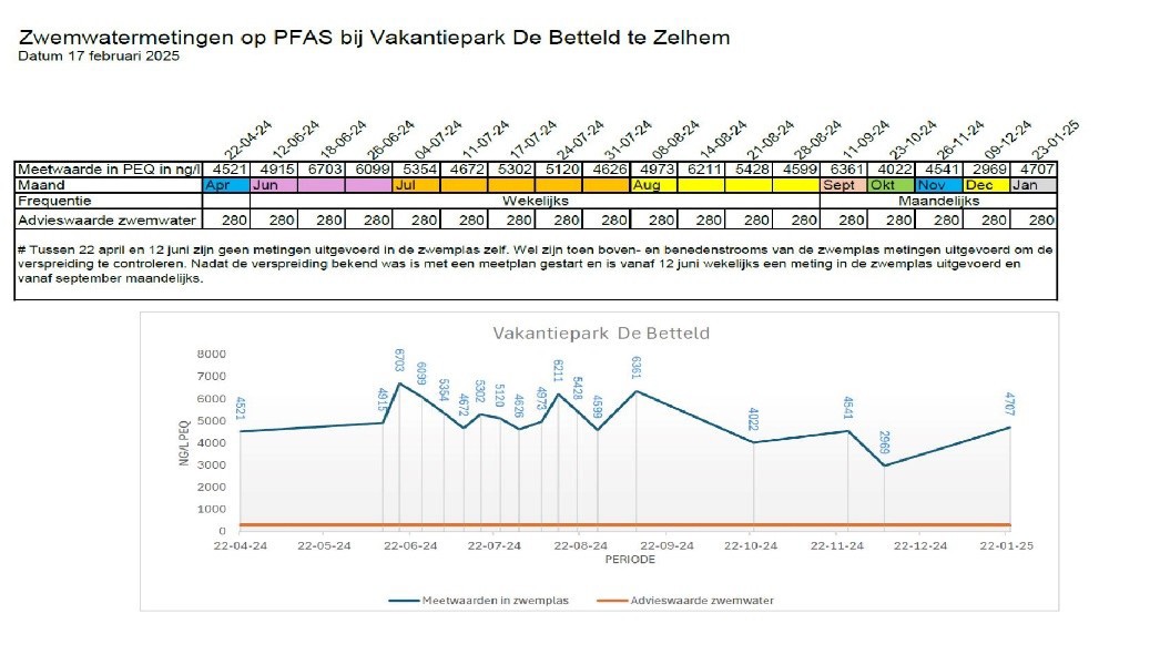 Tijdens het badseizoen 2024 heeft het waterschap na de eerste meting in april vanaf juni wekelijks en daarna vanaf september maandelijks metingen uitgevoerd in het oppervlaktewater ter plaatse van Vakantiepark de Betteld. Uit de actuele metingen van het waterschap blijkt dat de advieswaarden van het RIVM vele malen worden overschreden. De resultaten uit de metingen vertonen geen dalende lijn.