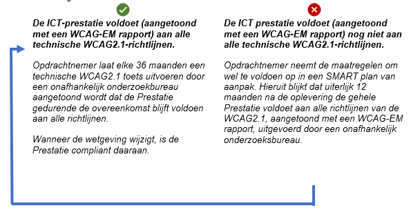 Indien producten met een interface ontworpen voor menselijke gebruikers en/of oplevering van Kantoorbestanden onderdeel zijn van de Prestatie dient de Prestatie gedurende de gehele looptijd van het contract aantoonbaar te voldoen aan de wettelijk vigerende eisen voor digitale toegankelijkheid (EN 301 549). Voor meer informatie: zie Een toegankelijke digitale overheid.