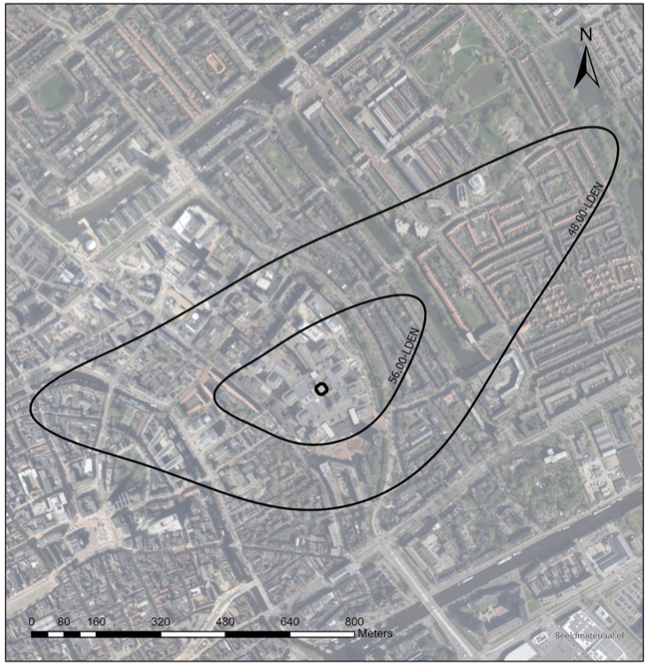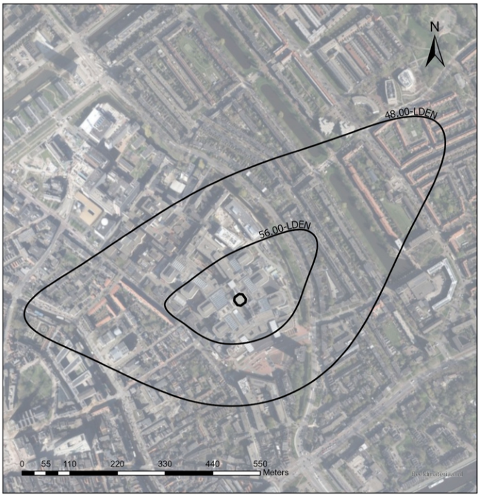 De geluidscontouren van de waarden 48 en 56 dB(A) Lden zijn ook weergegeven op kaart 2.