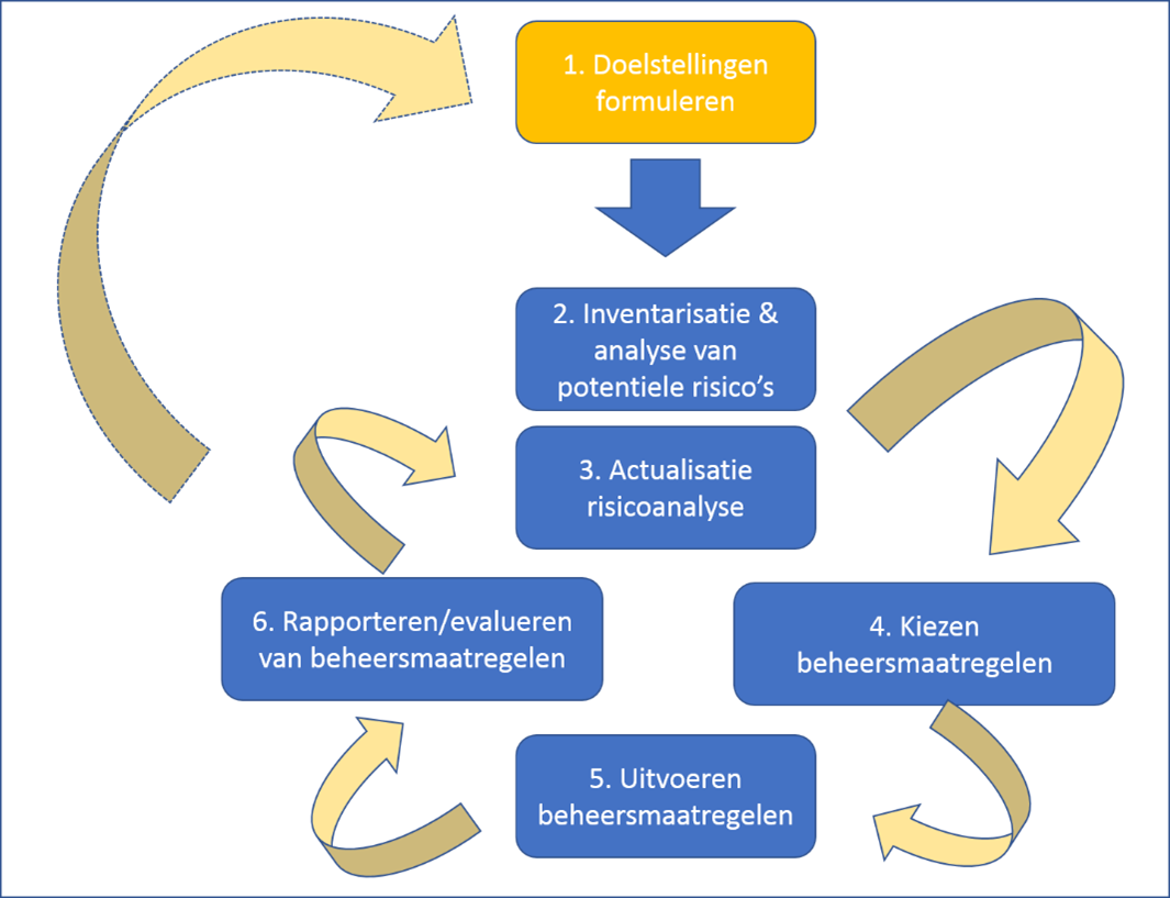 Risicomanagement is een cyclisch proces (zie figuur 1) en start met het bepalen van de doelstellingen. Vervolgens volgt een inventarisatie én analyse van potentiële risico’s. De volgende stap is het kiezen van beheersmaatregelen om te bepalen hoe de organisatie met de risico’s om gaat. Daarna volgt de implementatie van de beheersmaatregelen. De laatste stap is het rapporteren en evalueren. Omdat niet alleen de provincie en de omgeving maar ook wet- en regelgeving kan veranderen moet regelmatig opnieuw worden bepaald of de uitgangspunten nog actueel en valide zijn.