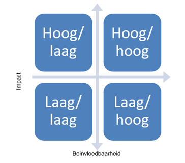risico’s met een hoge beïnvloedbaarheid en hoge impact. Dit zijn risico’s die de strategie van de organisatie zowel positief als negatief kunnen beïnvloeden. Deze risico’s hebben een grote impact op het behalen van de doelstellingen en komen voornamelijk voort uit de eigen strategische keuzes van de organisatie. De belangrijkste vraag bij deze groep risico’s is hoe groot de risicobereidheid van de organisatie is. In de beheersing krijgen deze risico’s veel aandacht;