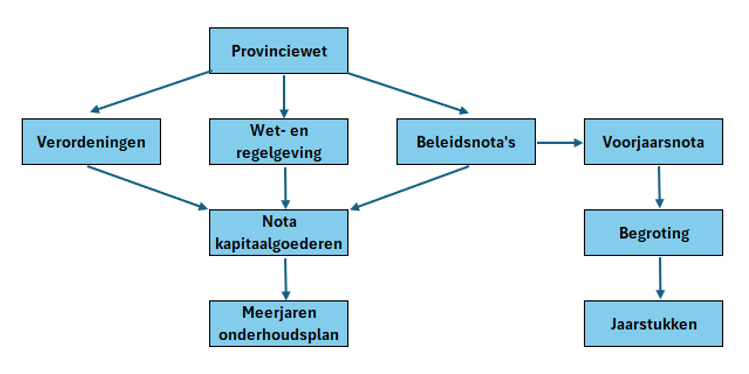 Het in stand houden van de provinciale kapitaalgoederen is een wettelijke taak van de provincie (zie hoofdstuk wet- en regelgeving). Het Besluit Begroting en Verantwoording Provincies en Gemeenten (BBV) stelt (artikel 9, lid c) dat in de begroting een paragraaf moet worden opgenomen met betrekking tot de kapitaalgoederen. Hierin moet zijn opgenomen (artikel 12, lid 2); het beleidskader, de uit het beleidskader voortvloeiende financiële consequenties en de vertaling van de financiële consequenties in de begroting. Het doel is dat hiermee kapitaalvernietiging en achterstallig onderhoud wordt voorkomen. Er wordt niet specifiek ingegaan op het beheer en onderhoud van de individuele assets en de onderhoudsplanning. Deze zijn weergegeven in de beleidsplannen die per kapitaalgoed zijn opgesteld.