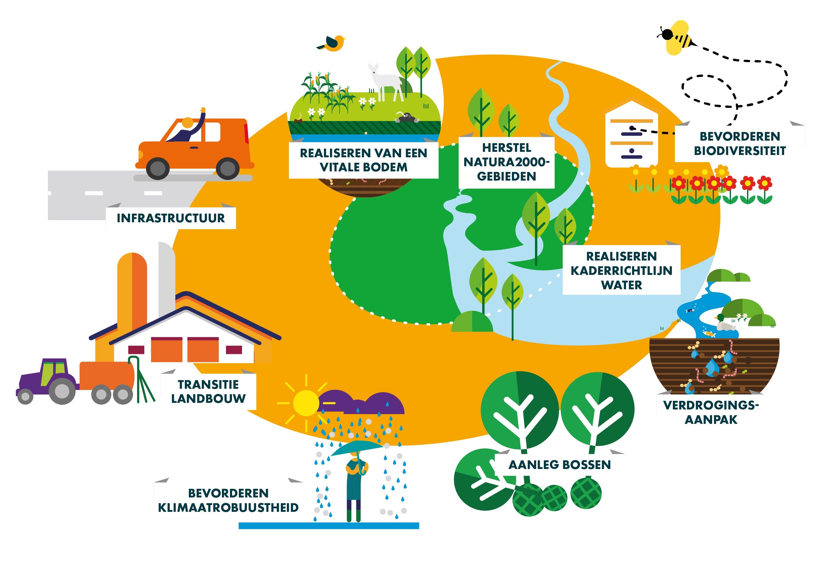 Hiervoor hebben we een klimaatbestending en veerkrachtig water- en bodemsysteem nodig. Daarbij is een trendbreuk nodig: een nieuwe manier van denken waarbij de draagkracht van het water- en bodemsysteem leidend is voor het gebruik, in plaats van andersom. Dit vertaalt zich in de volgende ambitie: