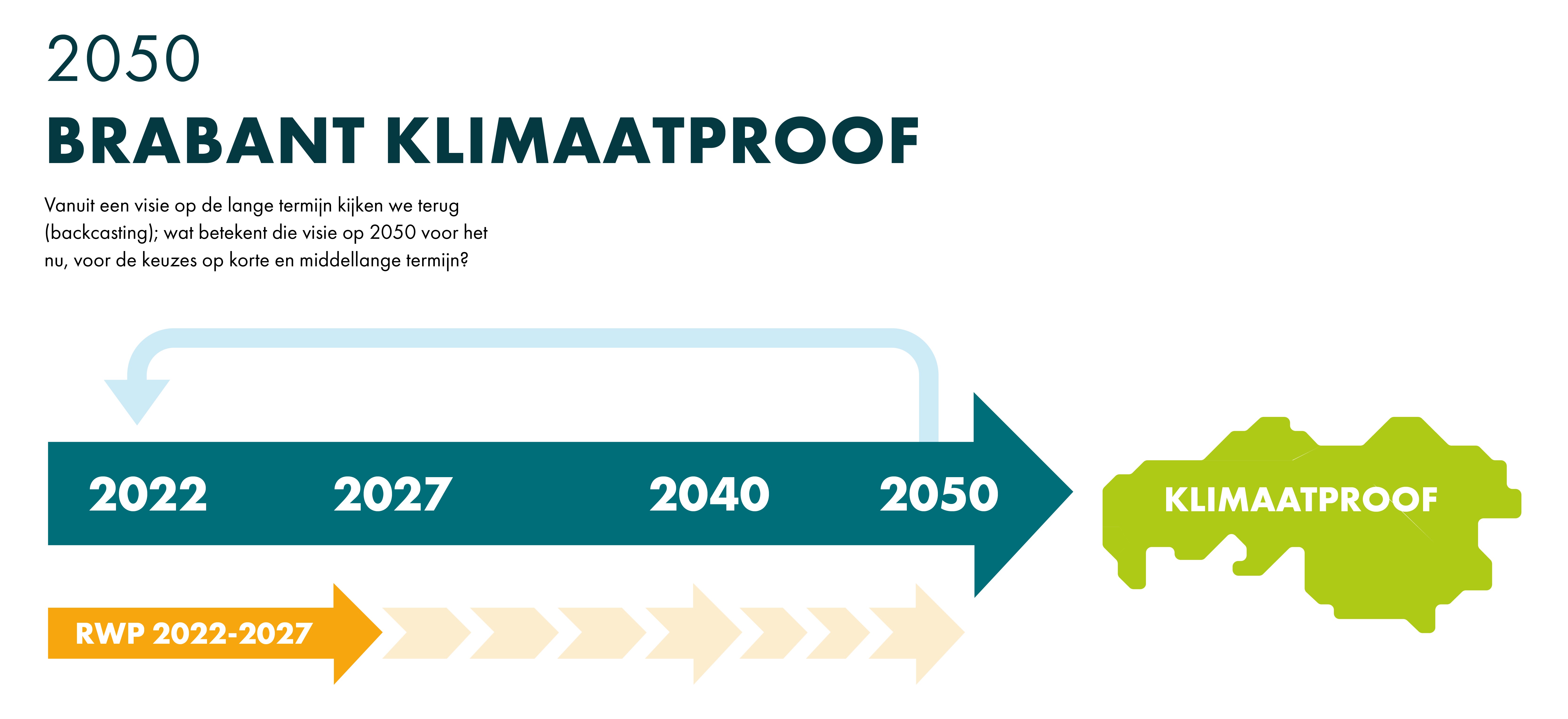 Het kost tijd om de samenhang en natuurlijke werking van het water- en bodemsysteem (‘de (grond) watermachine’) te herstellen en de voor Brabant zo belangrijke grondwatervoorraden weer aan te vullen. De provincie gaat er van uit dat er ca. twee decennia nodig zijn om maatregelen te treffen, effecten te monitoren, bij te sturen waar nodig en in de loop van de tijd voldoende in te kunnen spelen op de zich ontvouwende effecten van klimaatverandering. Een klimaatrobuust water- en bodemsysteem in 2050 vereist dus dat beleid en aanpak van de provincie in 2030 volledig toegepast kunnen worden;