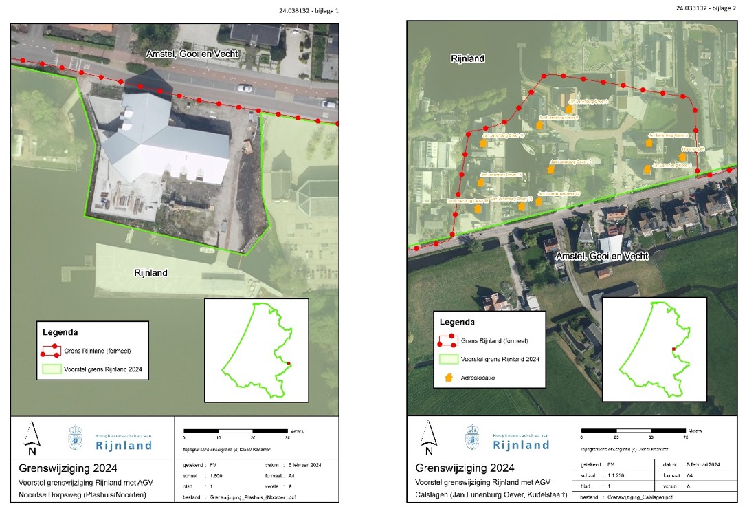 De twee belangrijkste grenswijzingen tussen Hoogheemraadschap van Rijnland en Waterschap Amstel, Gooi en Vecht betreffen de locaties Plashuis in Noorden en Calslagen in Kudelstaart. Deze zijn het gevolg van ruimtelijke ontwikkelingen ter plaatse, waaronder het aanpassen van de waterkeringen die in beheer zijn bij Waterschap Amstel, Gooi en Vecht. Dit maakt het wenselijk om de grenzen aan te passen. Hierbij is er voor gekozen om de grens zo te leggen dat de betrokken ingelanden bij het waterschap dan wel het hoogheemraadschap gaan horen van wiens handelen zij de waterstaatkundige gevolgen ondervinden. In de detailkaarten hieronder wordt per locatie de oude en de nieuwe grens weergegeven.