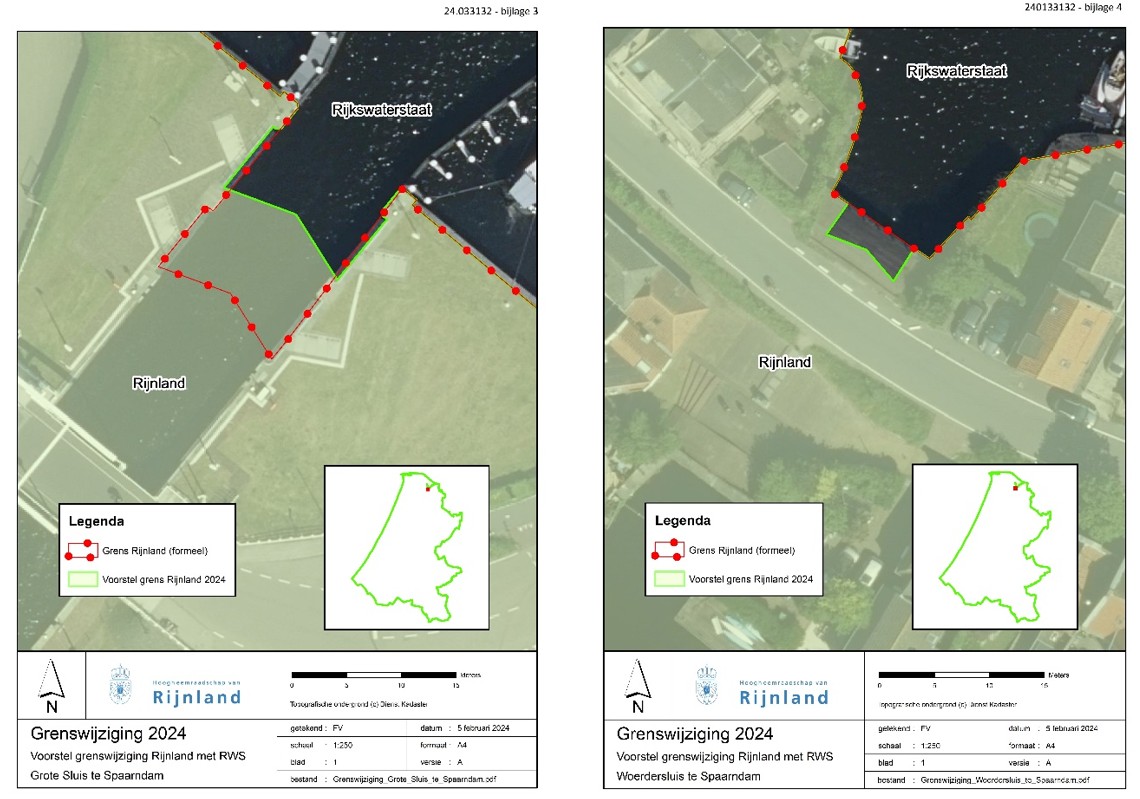 De twee belangrijkste grenswijzigingen tussen Rijnland en Rijkswaterstaat zijn bij de locaties Grote Sluis en de Woerdersluis te Spaarndam. Daar moet de grens worden aangepast aan de wet- en regelgeving over de grenzen van rijkswater in de Omgevingsregeling. Hierbij is onderling de afspraak gemaakt dat de grens van het beheergebied ligt op de daadwerkelijke waterkering. In de detailkaarten hieronder wordt per locatie de oude en de nieuwe grens weergegeven.