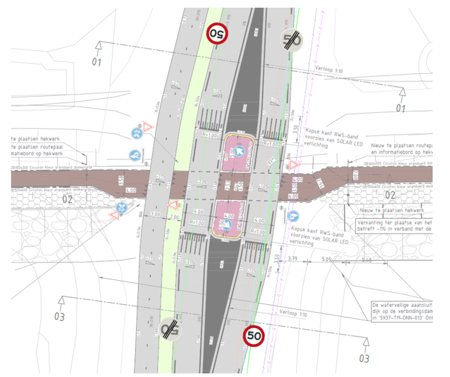 Om deze lagere snelheid te ondersteunen en af te dwingen is er op de N518 aan weerszijde van de oversteeklocatie een verkeersplateau als verticale snelheidsremmer geplaatst. Voor het plaatsen van de verkeersborden met de nieuwe verlaagde maximumsnelheid (verkeersbord A1 50), de voorrangsborden (verkeersbord B6) en borden die een verplichte rijrichting aangeven (verkeersbord D2) is een verkeersbesluit nodig.